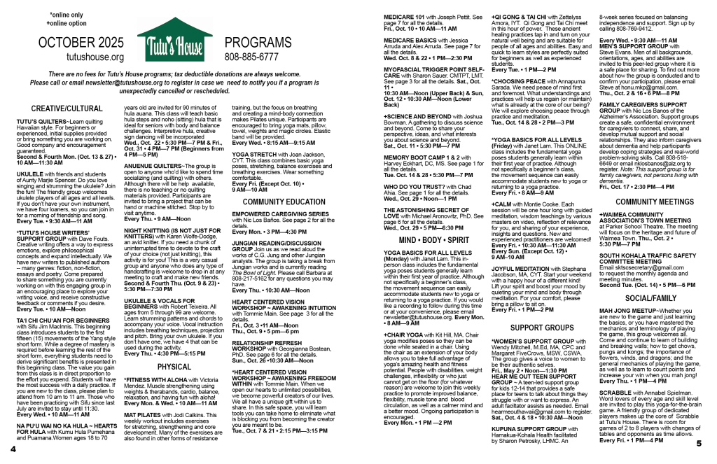 - All participants for in-person activities are required to register in advance by calling us at 808-885-6777 or emailing newsletter@tutushouse.org; this will allow us to be sure our space is prepared for you.